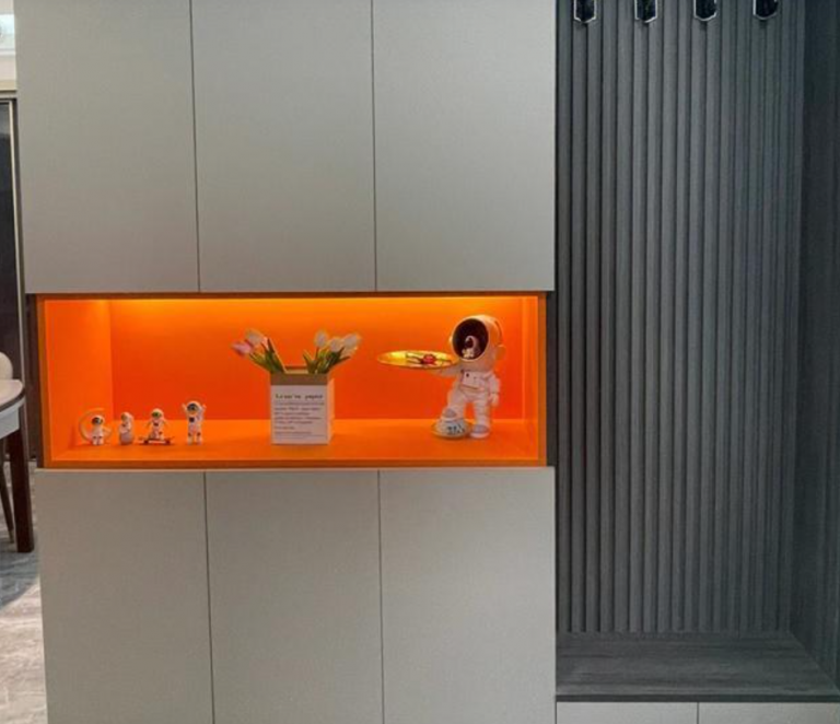 裝修輕奢風(fēng)格,從入戶門進來擁有獨立的玄關(guān),根據(jù)需求設(shè)計了一個自帶換鞋凳上下兩層的鞋柜。鞋柜整個色調(diào)都是灰色,中間加了橙色的搭配,視覺上很搶眼,類似打破了整個鞋柜寧靜的感覺,讓人一進屋看到,眼前一亮!鞋柜安裝了黑色的掛鉤,以后可以掛包包或者衣物,真心不錯。家里如果也喜歡這樣的設(shè)計,可以參考一下!