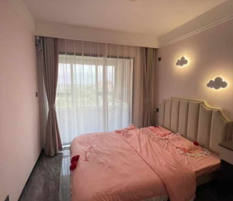 臥室空間不大,一張床加上床頭柜和衣柜基本沒有什么多余的空間了。床頭墻上安裝了網(wǎng)紅款的云朵壁燈,顏值非常高,可以起到很好的裝飾效果!頂面是沒有安裝吊頂,僅僅走了一圈石膏線條,看起來很有空間感。窗戶的位置設(shè)計了窗簾盒,顯得比較美觀,細節(jié)處理真心不錯!