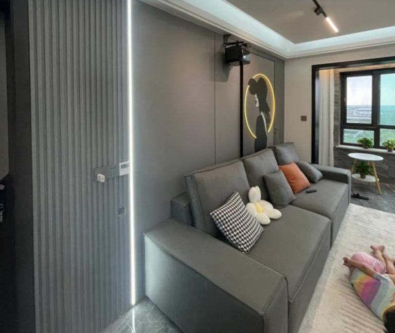 做了簡單的電視背景墻,設(shè)計了格柵,效果還是蠻不錯的。而且還加了線條燈裝飾,可以起到很好的氛圍效果,看著都很有檔次。而且還安裝了投影儀,以后可以方便使用。感受家庭影院的感覺!